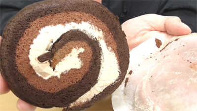 二色のスポンジケーキに、クリーム、角切りチョコが巻き込まれております。