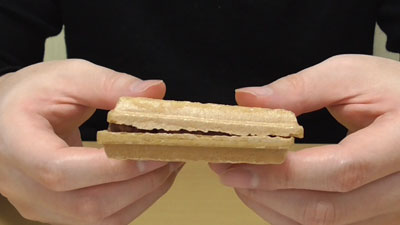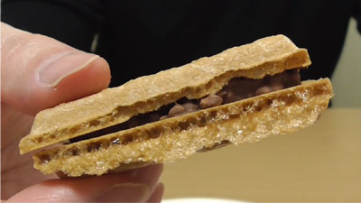 モナカはサクサク食感で香ばしさを、パフ入りチョコは軽さも感じるサクザク食感で、優しい甘さにチョコの風味を提供してくれます。